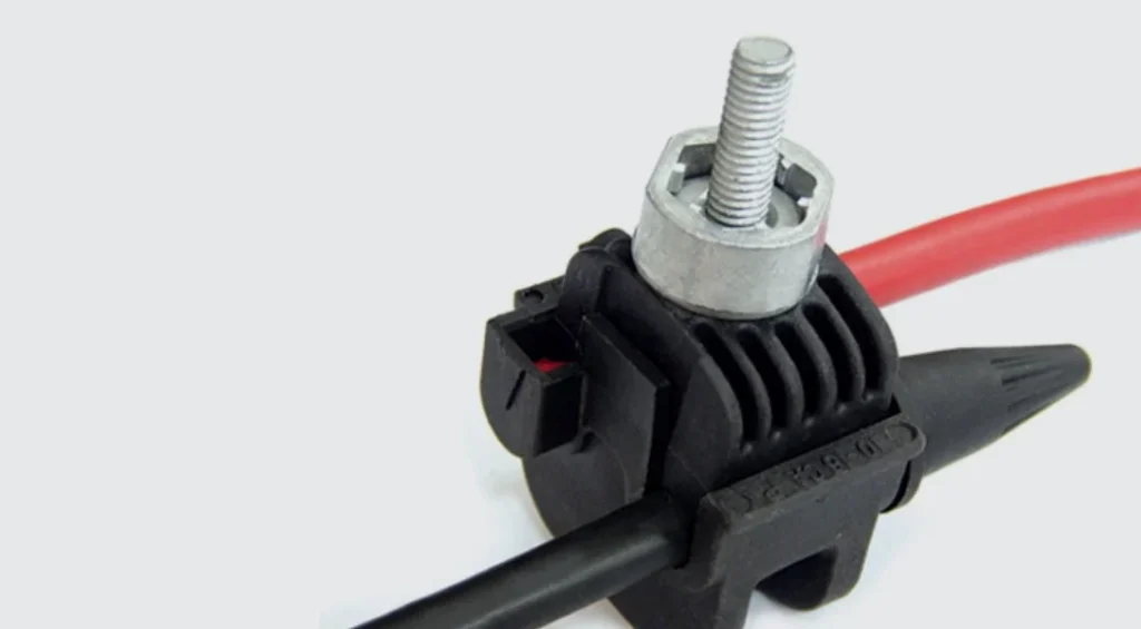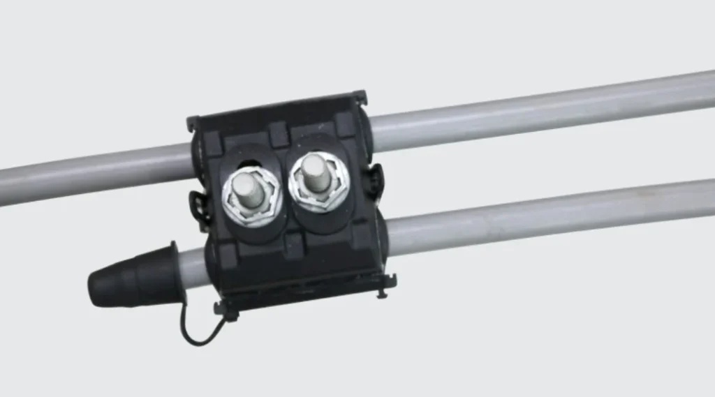 O conector cunha de alumínio (CADC) é vantajoso por ser adequado para diversas bitolas e materiais (alumínio, alumínio com alma de aço e cobre). No entanto, sua instalação em cabos multiplexados exige a remoção da isolação e o uso de uma ferramenta especial de propulsão.
